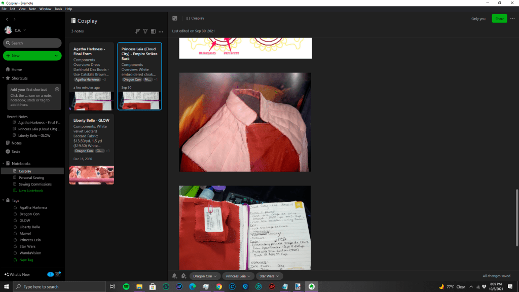 I do have a couple more things I’m working on. Coming up (Gally/Disneyland) I need to make a set of ears for my Disneybound Agatha Harkness – since a friend is going to bound as Wanda! I’ve got all of the components (except the fabric above that I wanted to use to make the bow), so it’s just a matter of getting them made. I’ll make a small notebook page for them, nothing really worthy of a whole Evernote workbook.