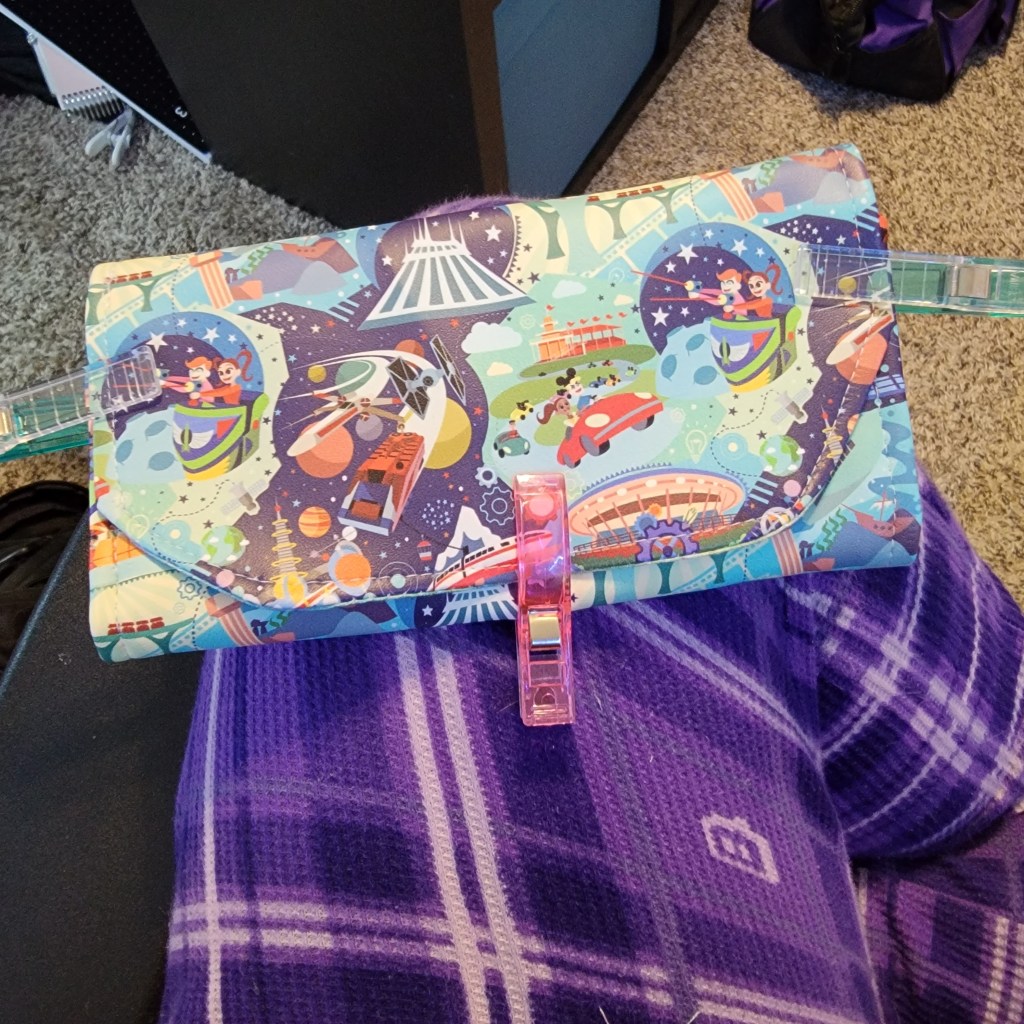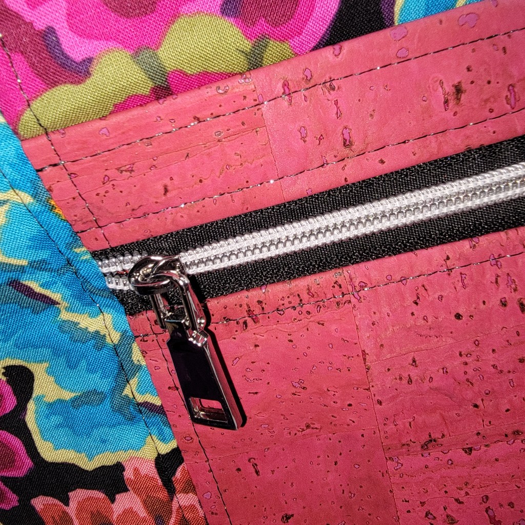 Wallet Pattern: Self-drafted – inside there’s a cash and card slot from the same black cork, and a zippered pocket with a castle pull from Wizard Stitchery & Crafts.