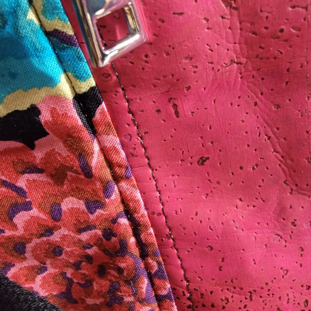 I made this bag, wallet, and a matching keyfob for myself as a transition into making bags out of vinyl and cork instead of regular fabric, and woo was it a learning experience! I also used PU bias tape around the top edge of the bag (not shown) to finish it off. Next time I’ll either edge coat OR I’ll properly birth the bag…ugh.