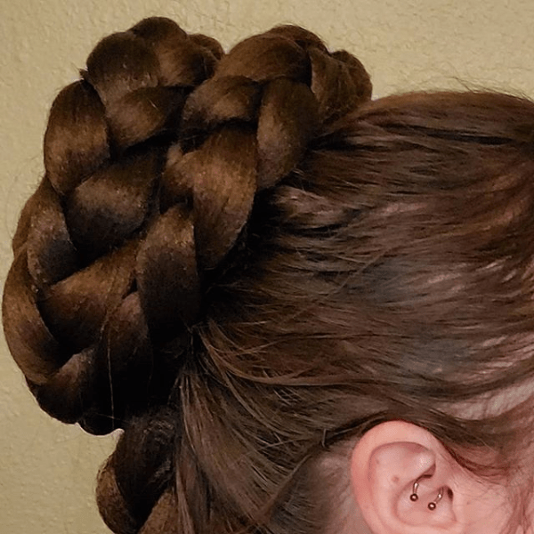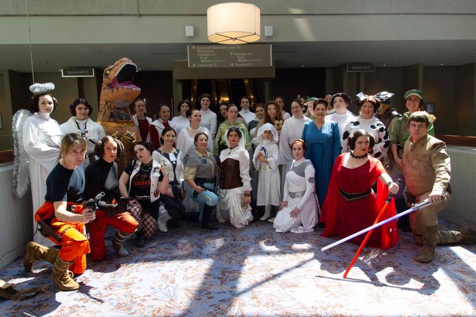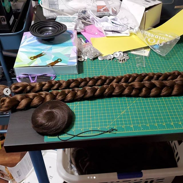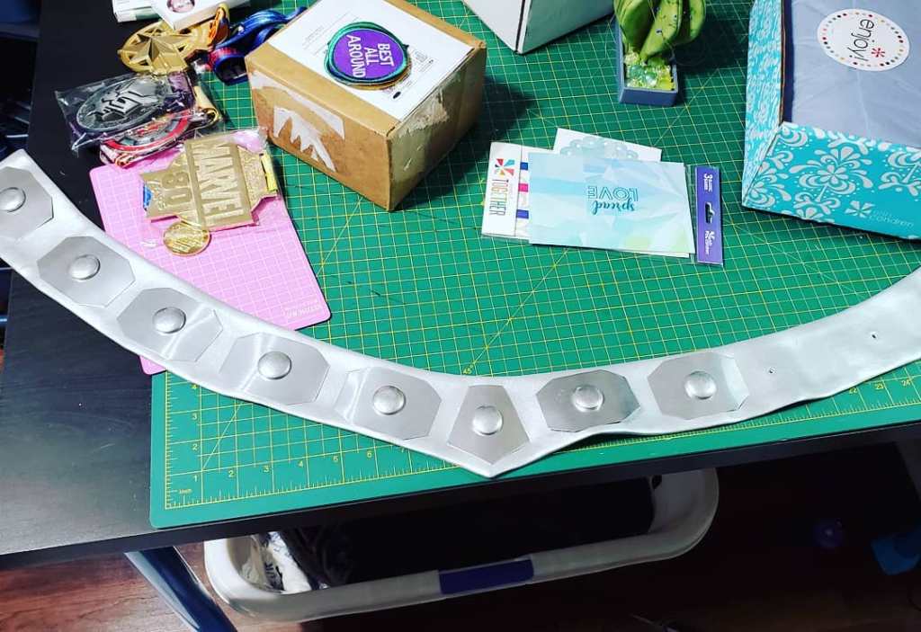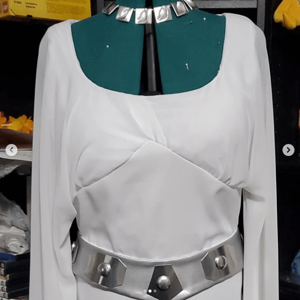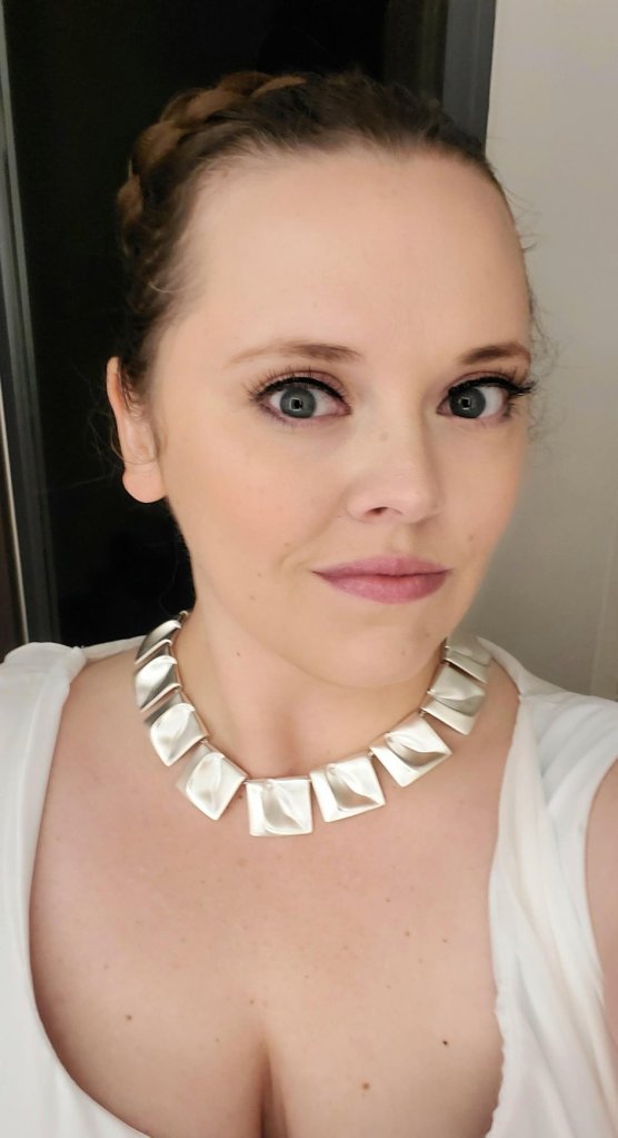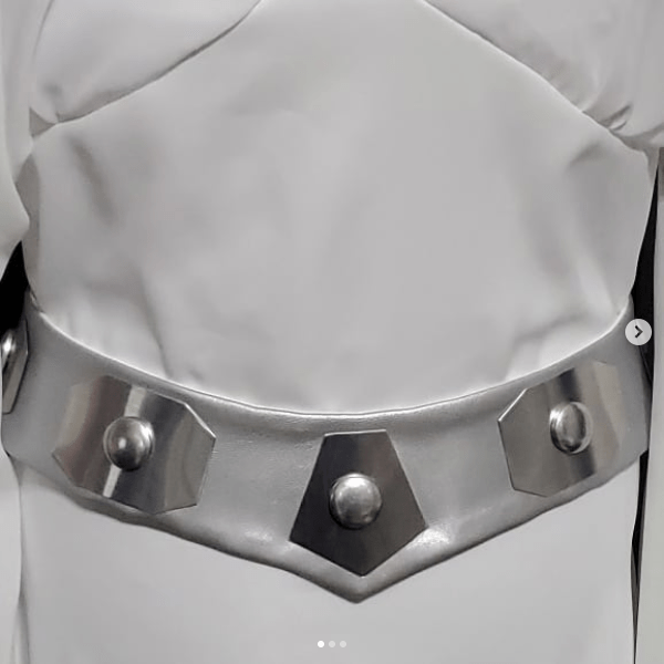 About the Costume: The gown is a basic A-line dress with an empire bodice that comes to a point at the front w/an inverted V. It is made from a knit underdress and chiffon overlay with 10″ train. The sleeves are large “wings” attached at the shoulder and bodice seam at the front to the side seams, which is actually incorporated into the front bodice piece (that includes the fold over the left side). The belt is made from silver vinyl and canvas and closes with snaps at the back. The metal plates are cut and sanded aluminum flashing and the button covers were used to make the round circles, which are all held on using Chicago screws. The original belt was made by Christine at CCcostumefactory but I added the additional two plates required for RL approval. The shoes are a low silver comfort heel I found on Amazon, which worked perfectly while running through hotels at DragonCon. The Necklace and Bracelet are both by Bjorn Weckstrom for Lapponia (Kalevala). The bracelet is a vintage piece, while I purchased the necklace new. Let me tell you, it’s worth paying the extra $500 to get the real deal rather than spending $2000 on a replica at Disney (there went my tax return last year LMAO). The hair is made from my own hair pulled up into a high ponytail/bun, and then with a bun cover and extensions added. I will write a tutorial regarding this hairstyle and link it here.