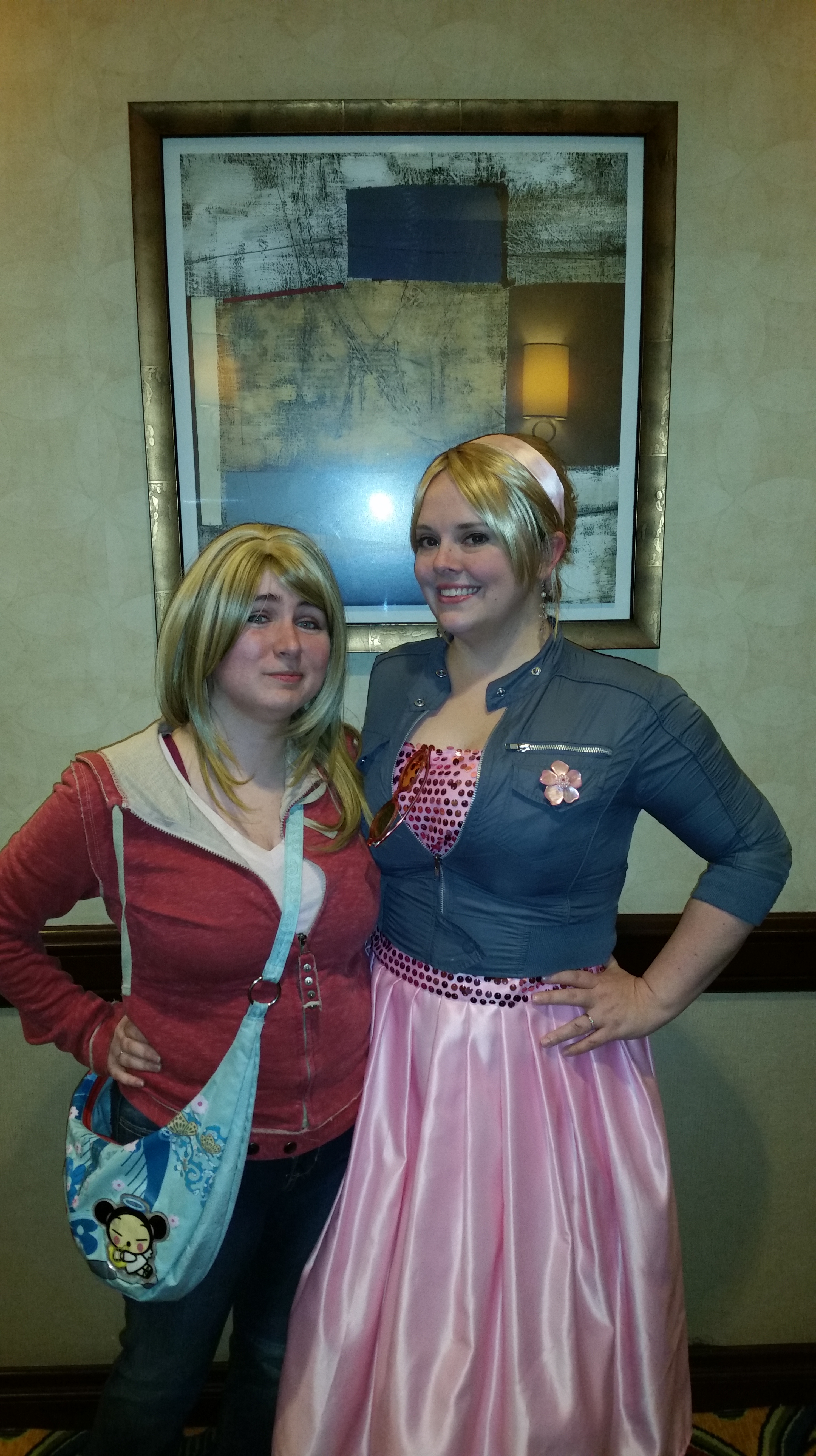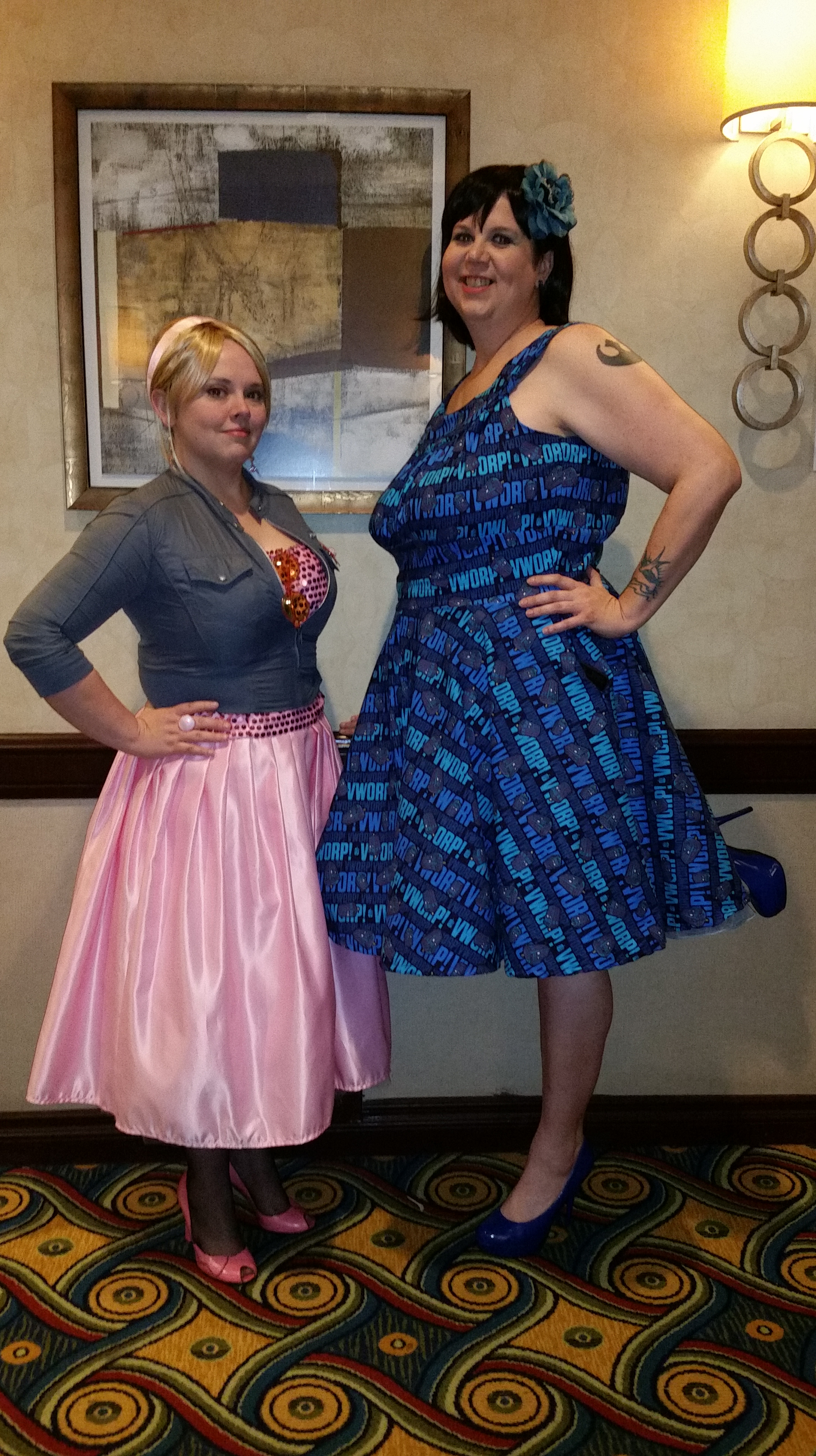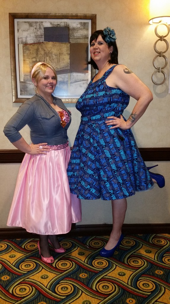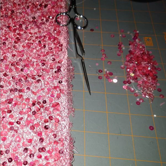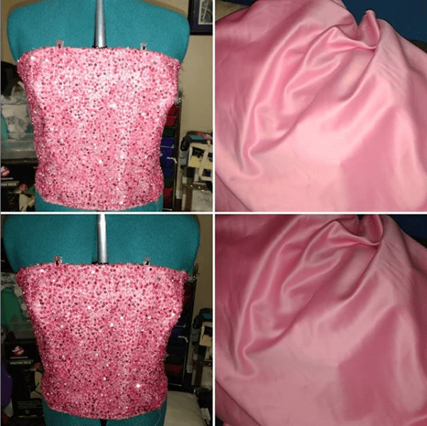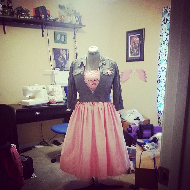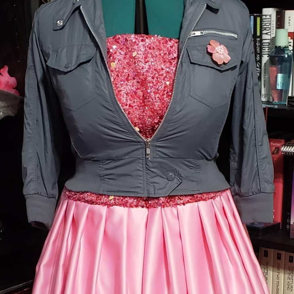 About the Costume: The dress itself is made from pink duchess satin as the original was. The sequined fabric is a mesh flat lined to the same satin, and the bodice is lined in cotton poplin. The petticoats involve two pink tulle petticoats with white sewn to the bottom to recreate how it’s worn on screen. The shoes are the Agent Provocateur “Jessica” in off white which I dyed/painted the accurate pink and black. The earrings were from etsy, the headband is a duchess satin pink with elastic at the bottom. The ring was a find on etsy as well. The jacket is the SA Topshop moto jacket and the mother of pearl flower brooch was a find online. The sunglasses were found on ebay.