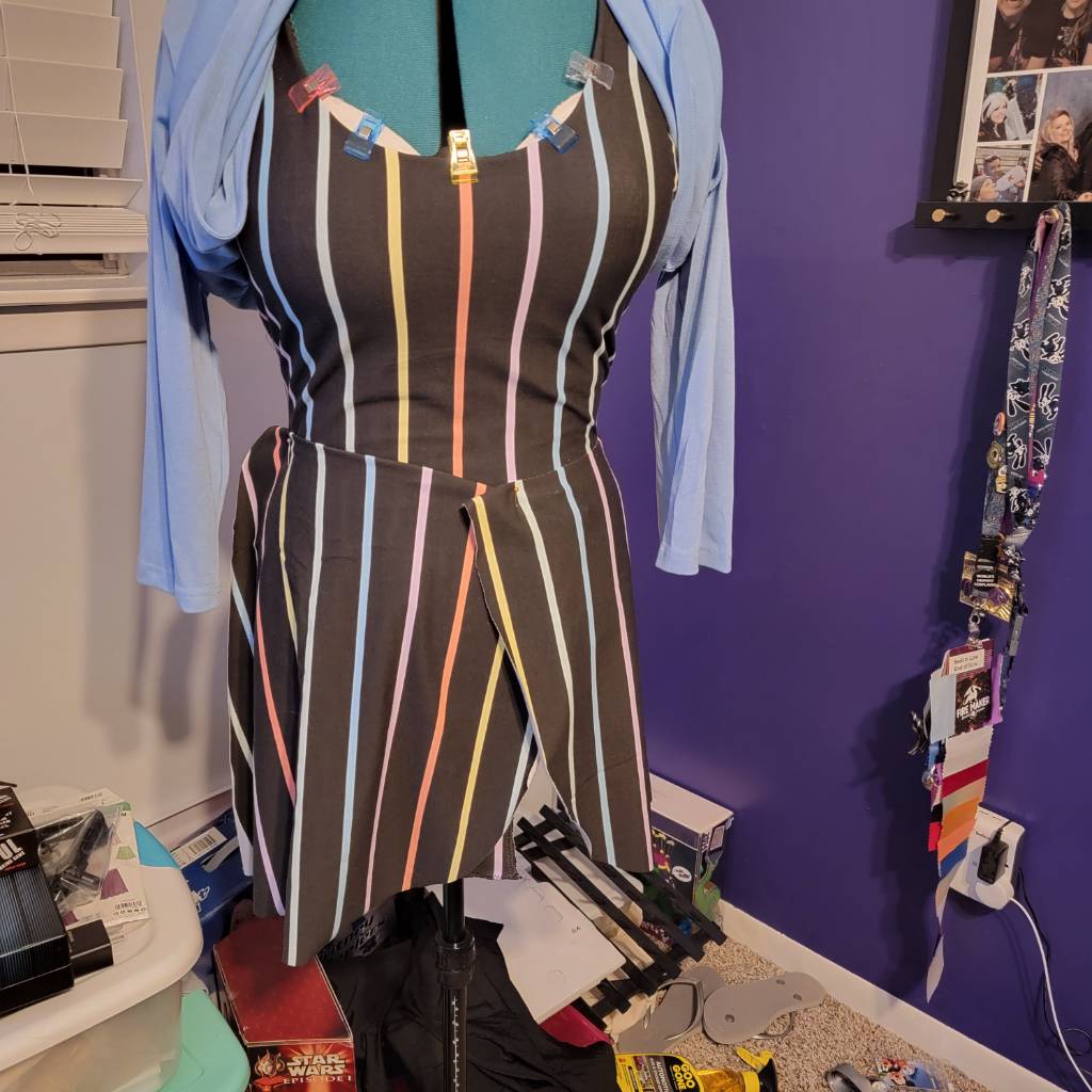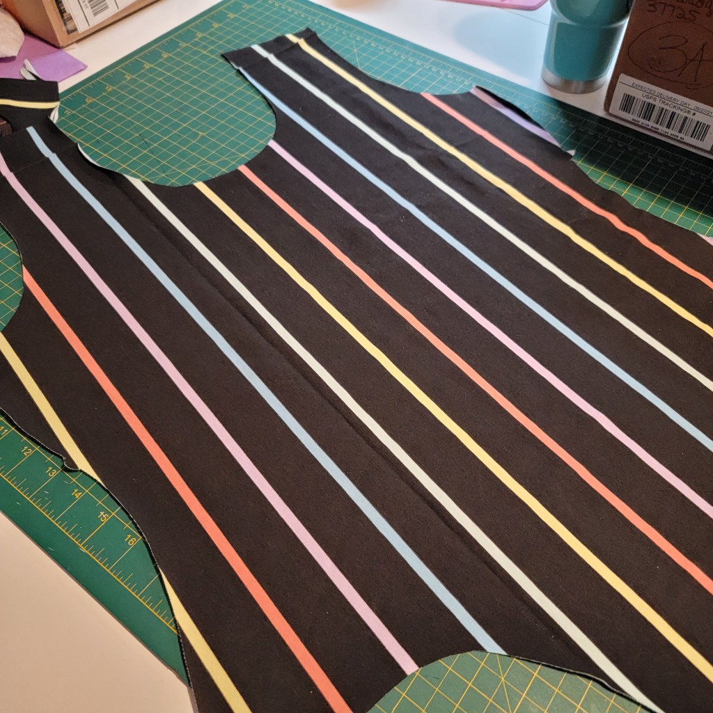 The leotard is made from a modified version of KwikSew 3502 (my go-to, and now discontinued) and the skirt from a modified version of Simplicity S8606. They are both made from black rainbow stripe organic cotton jersey from Tilly and the Buttons, and lined in 4-way jumbo spandex that I happened to have on hand. The skirt closes w/hook and eye closure.
