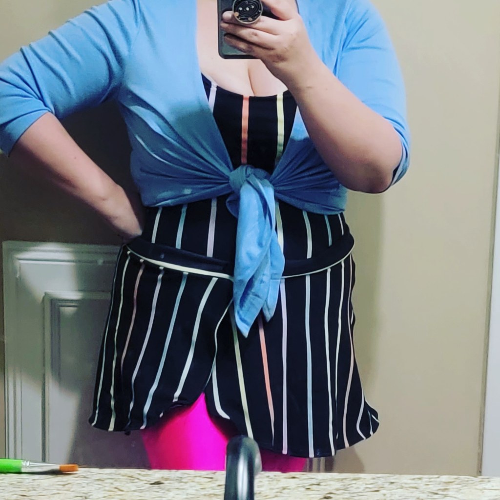 The cardigan is one I found on Amazon that ties at the waist. I didn’t feel like shortening the sleeves as I am more comfortable with 3/4 length. The tights are leggings I found on Amazon in bright af hot pink, and the purple leg warmers were also some I grabbed online. The shoes are my Reebok that I use for 1992 Movie Buffy.