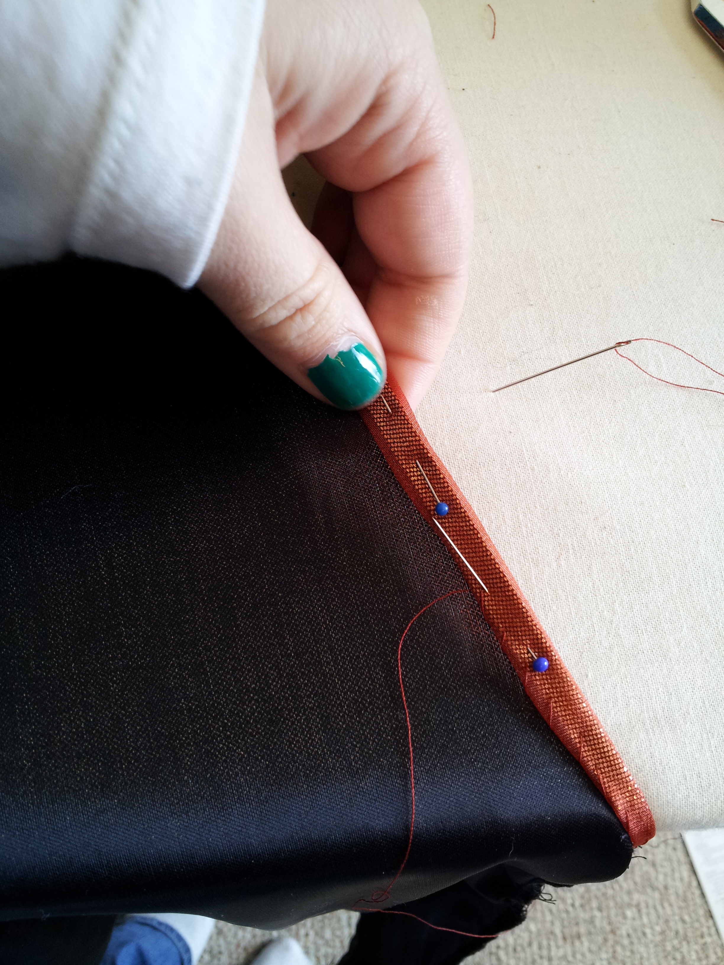 I then used a satin stitch along the entire bottom hem. For the organza, I serged the edges of each panel, and then serged the two panels together where I knew they would connect (which wasn’t much). I then did a rolled hem on all of the skirt edges of the organza. For the area of the pocket (on the right side), I left an area open big enough for the pocket and then rolled those openings and sewed them by hand. I did the same for inserting the pocket in the gold fabric.